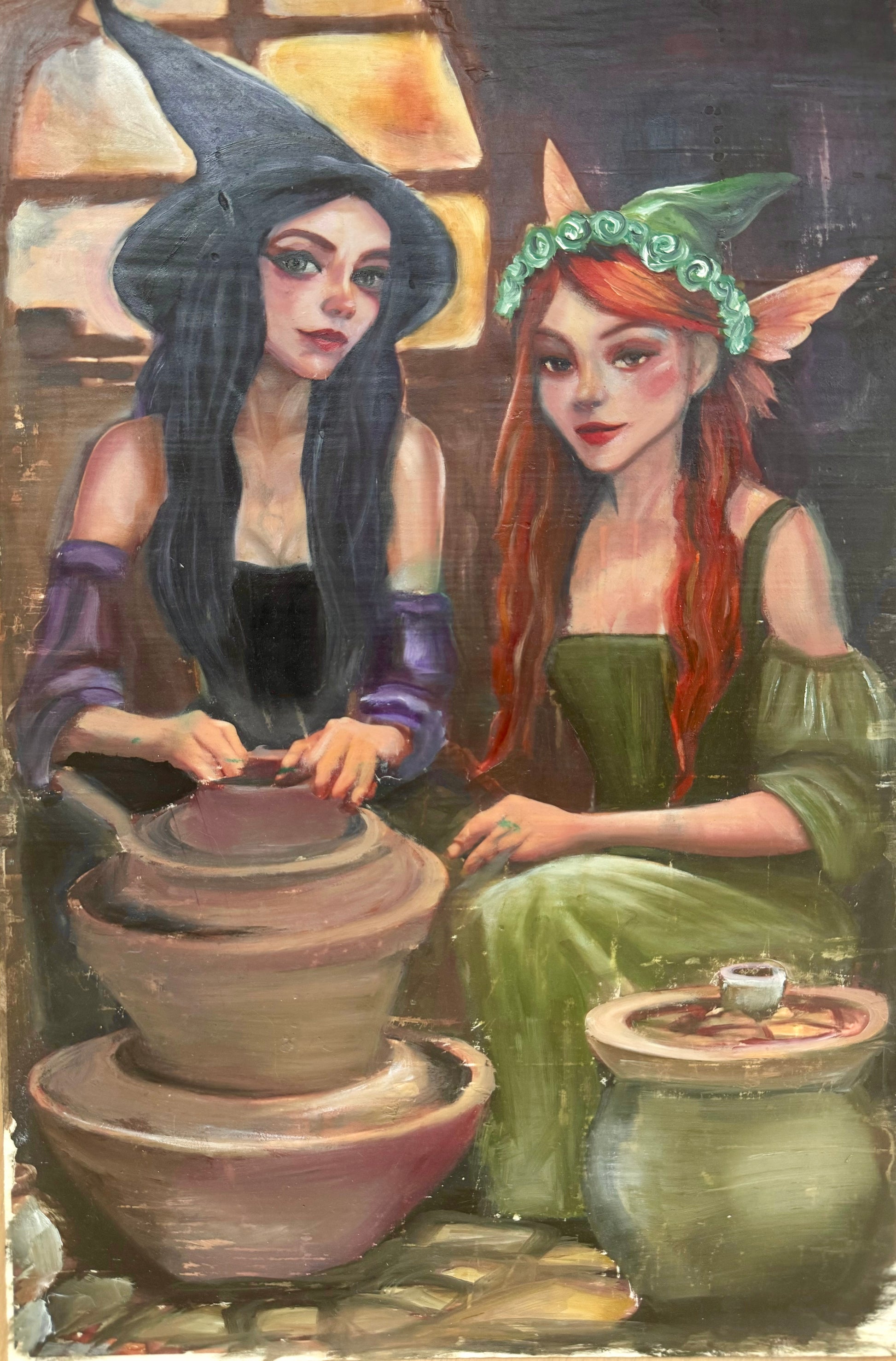 Elisa and renee as a fairy and witch doing pottery